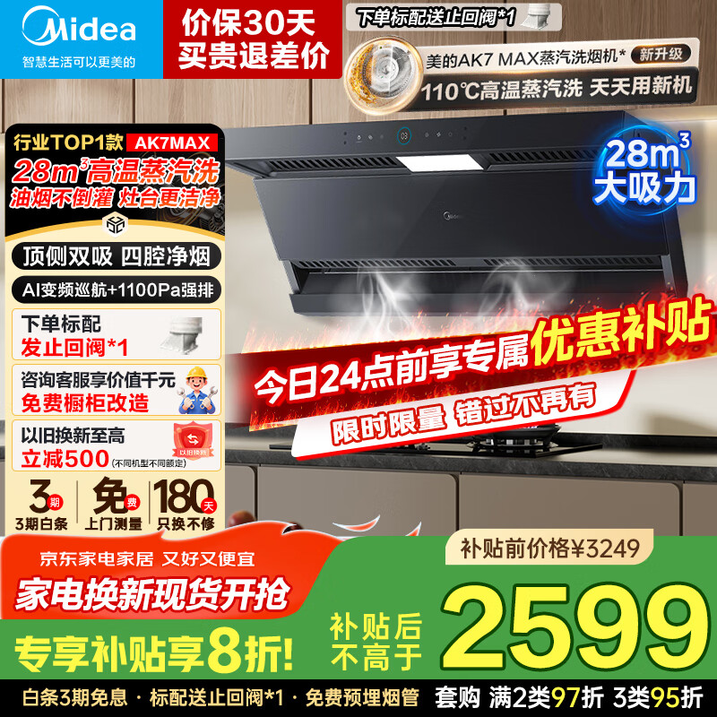 美的【蒸汽洗AK7PRO/MAX】抽油烟机家用28风量大吸力顶侧变频1100Pa双吸欧式自清洁一体式齐平橱柜烟机 【行业顶配AK7Max】28m风量顶侧双吸
