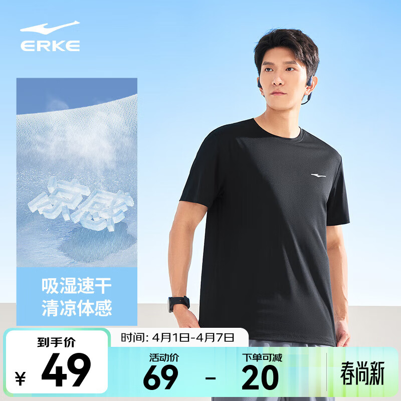 鸿星尔克冰感吸湿|T恤男夏季休闲舒适速干排汗短袖运动上衣男生 正黑 XL
