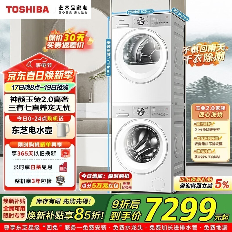 东芝(TOSHIBA)玉兔2.0高奢洗烘套装10KG大容量 全自动滚筒洗衣机+变频热泵烘干机 A级除味除皱 AI智能投放 DG-10T183BW+DH-10T183BW