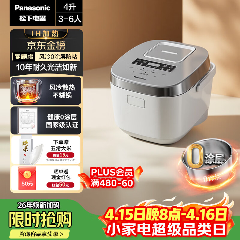 松下(Panasonic)Xtra零零煲电饭煲0涂层IH家用无涂层电饭锅4-5人不锈钢胆4升一级能效SR-HFS153C-W