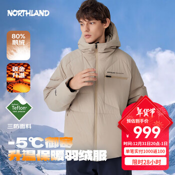 诺诗兰(NORTHLAND)冬季新款户外鹅绒羽绒服男女可升温连帽三防抗寒保暖面包服 悬崖卡其色 180cm (140-160斤 卡码拍小)