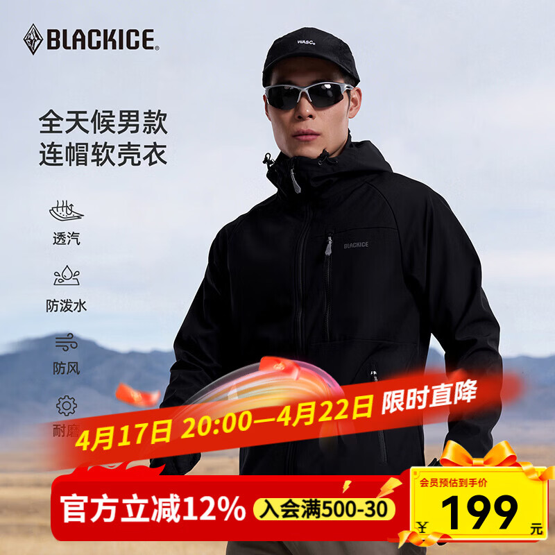 黑冰春季男款外套徒步防风防泼水耐磨弹力连帽软壳上衣 F2517MJ 黑色 L